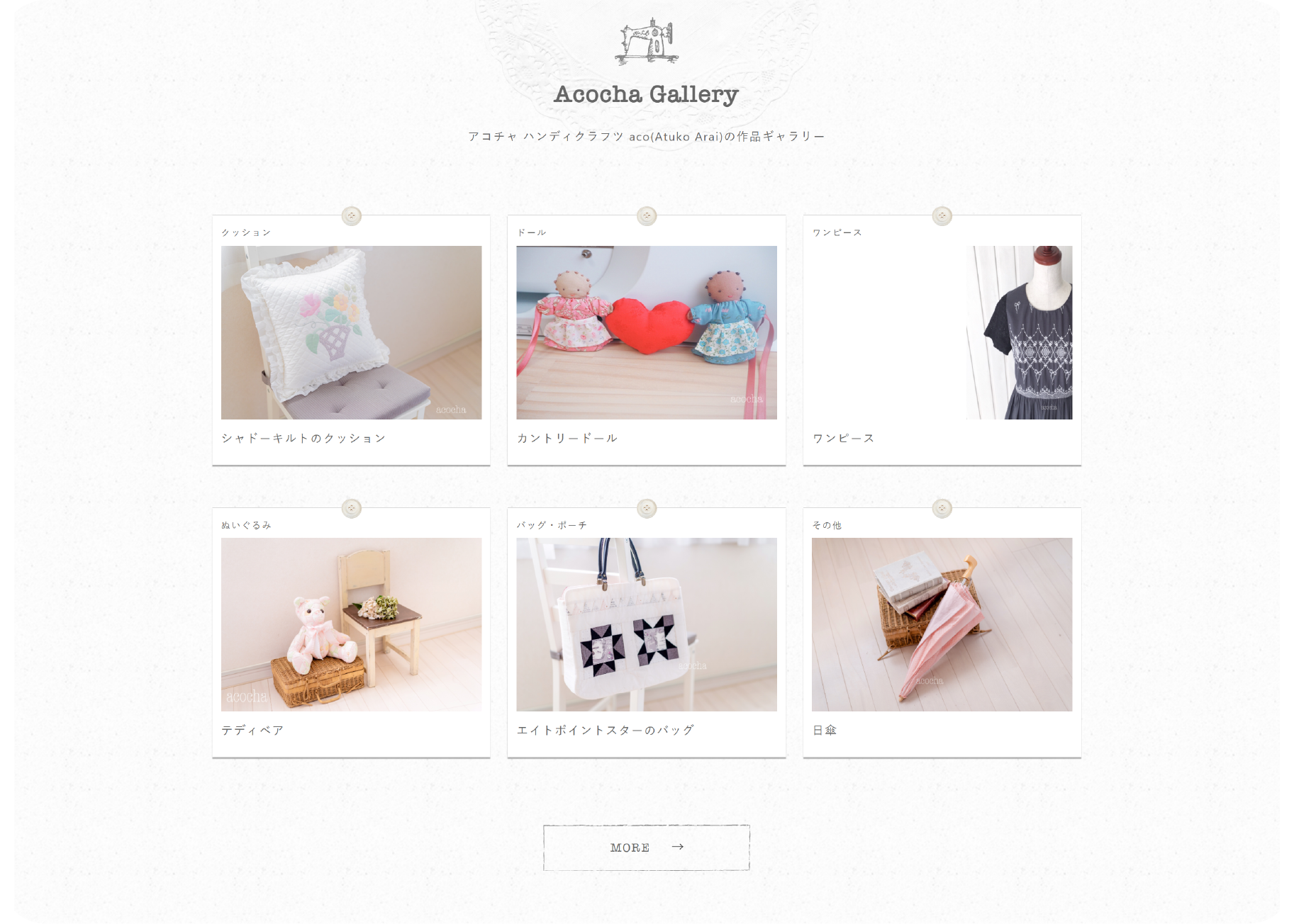 アコチャさんのレッスンを通してどんなものを作れるのか、どんな技術が身につくのかを伝えるため、ギャラリーページも制作し、あわせて作品撮りも行いました。