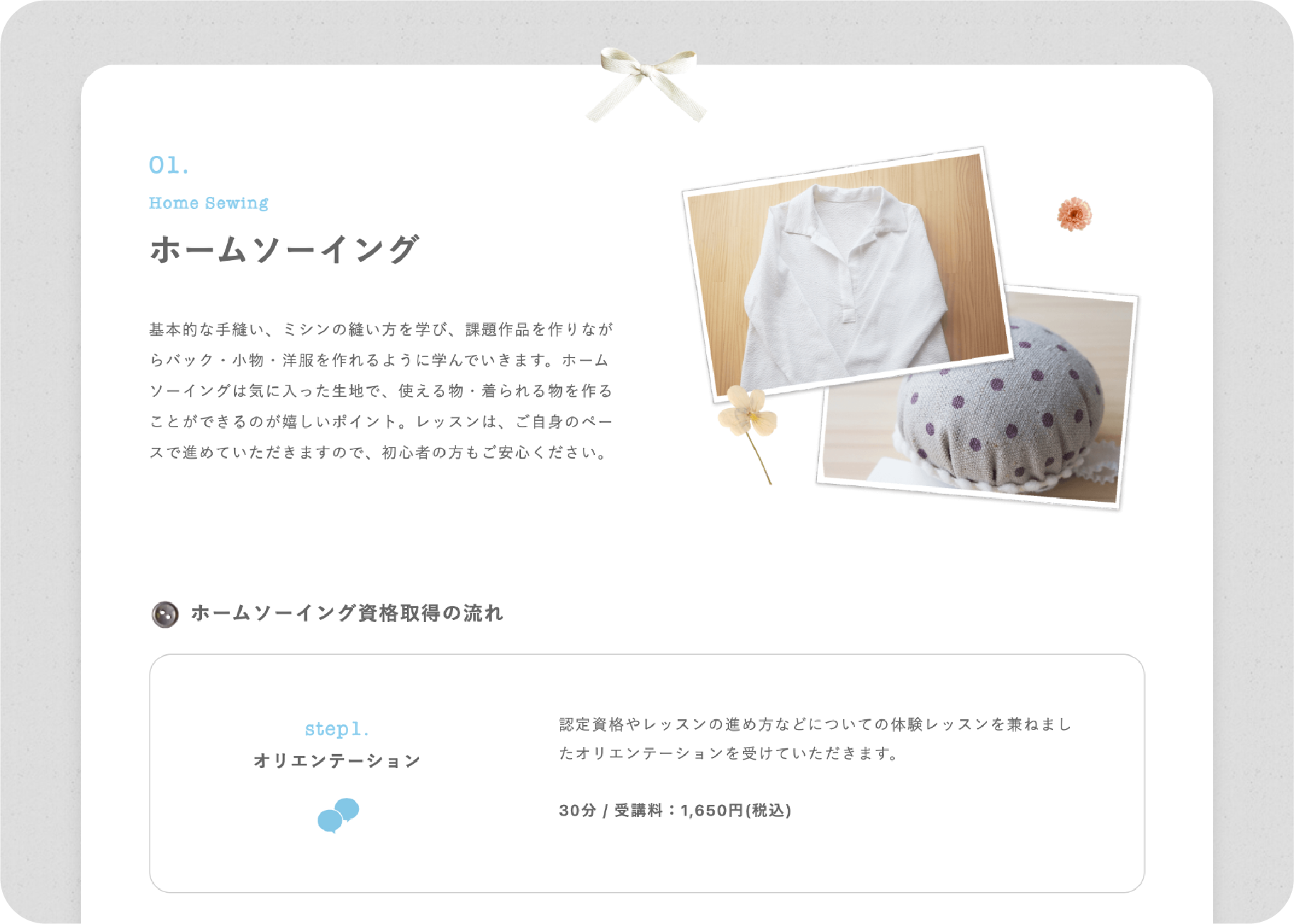 お話を伺うと、acoさんがサービスを通じて提供したいことは、「大人女子のくつろぎ時間」と「手仕事のある暮らし」だと感じました。それがしっかりと伝わるよう、サイトの基本のカラーは、上品さとほんのりと可愛らしいグレーを採用しました。布や糸の手触りが感じられるように、背景にレースや布の質感を載せ、お花やリボン、針仕事のお道具を控えめに散りばめ、シャビーなテイストで仕上げました。