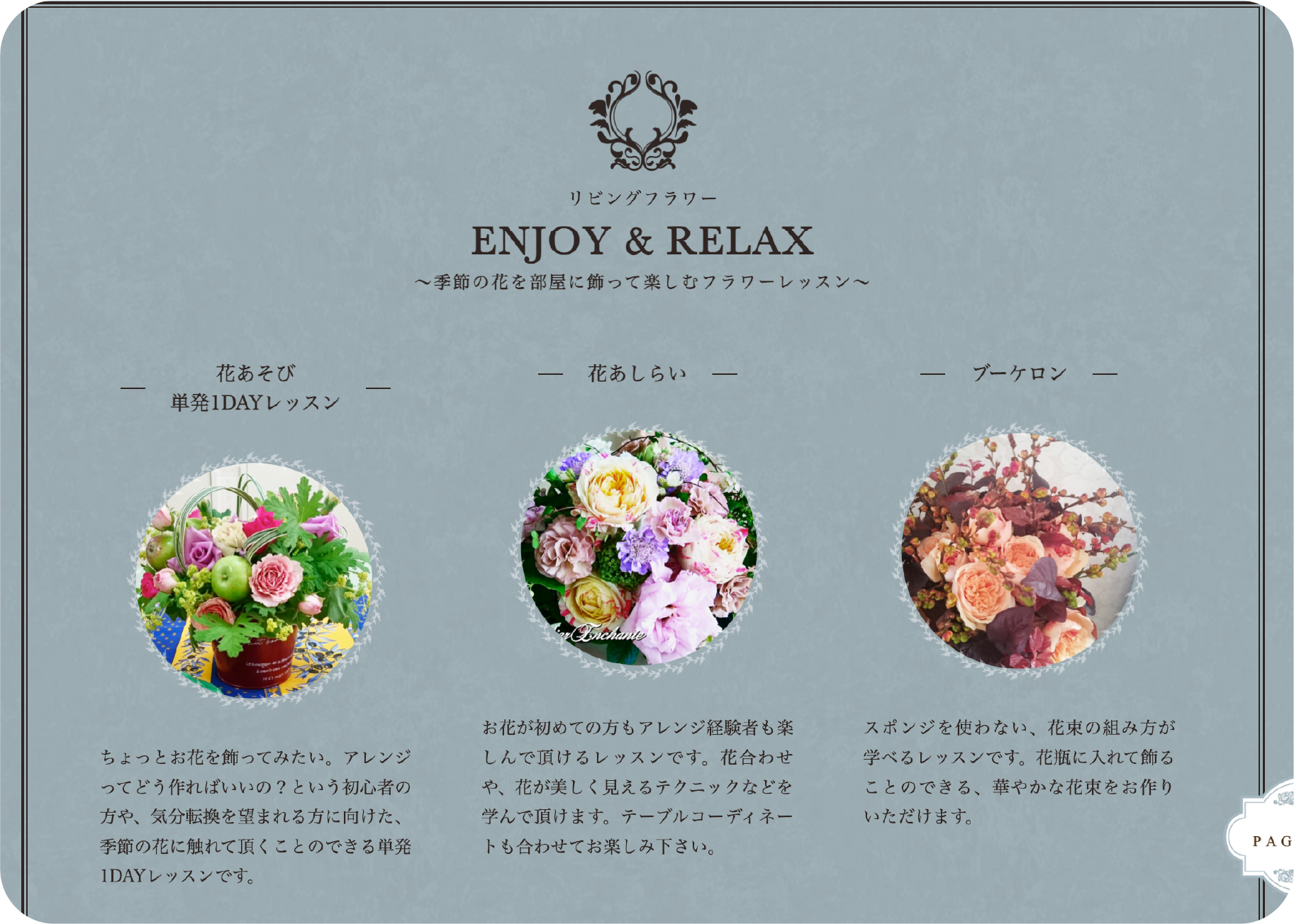 「花あそび1DAYレッスン」「花あしらい」「ブーケロン」など、異なる目的やスタイル・特徴が伝わるよう、やさしい言葉とシンプルな構成でまとめた上で、各ページに「体験レッスンはこちら」ボタンを設置。