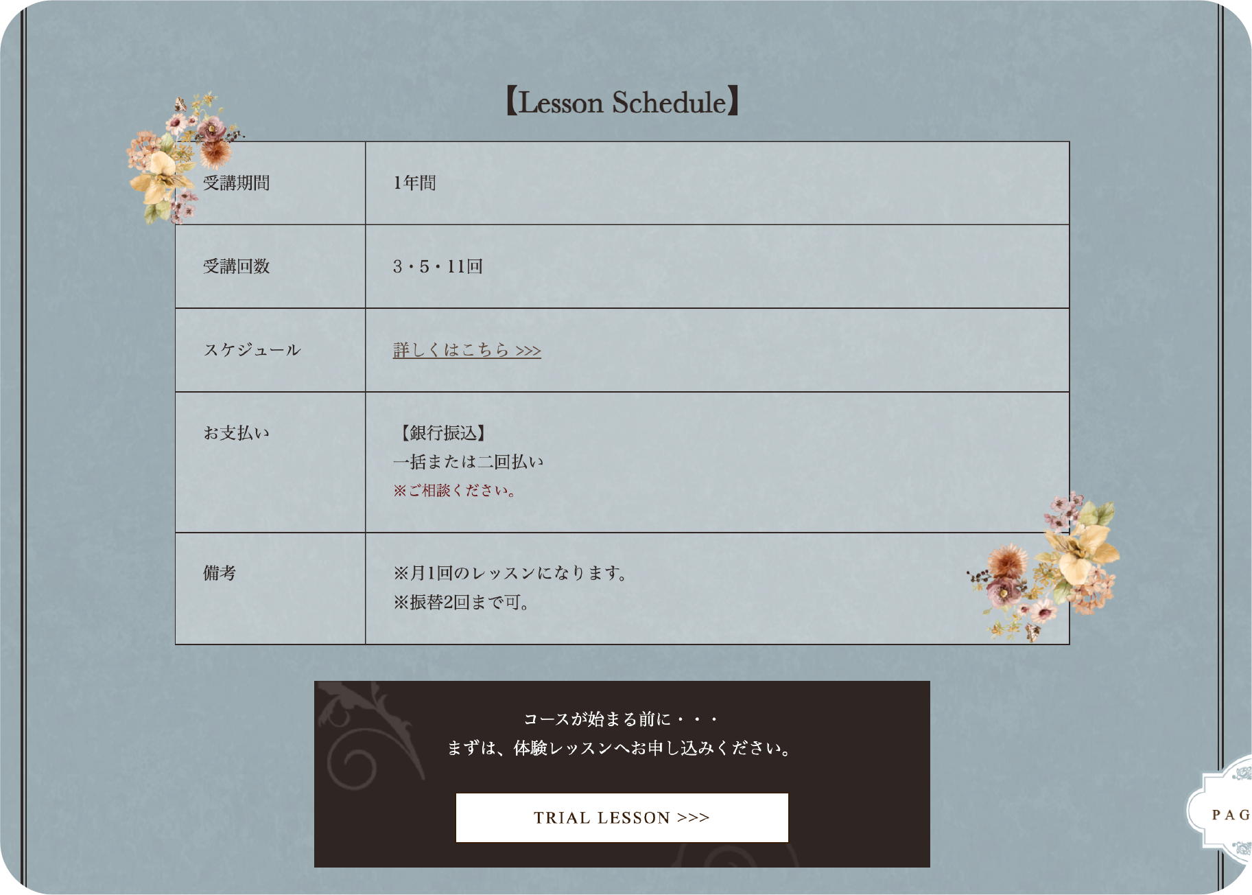 受講期間・料金・お支払い方法などの変化しない情報は、ホームページのレッスン詳細ページに掲載。