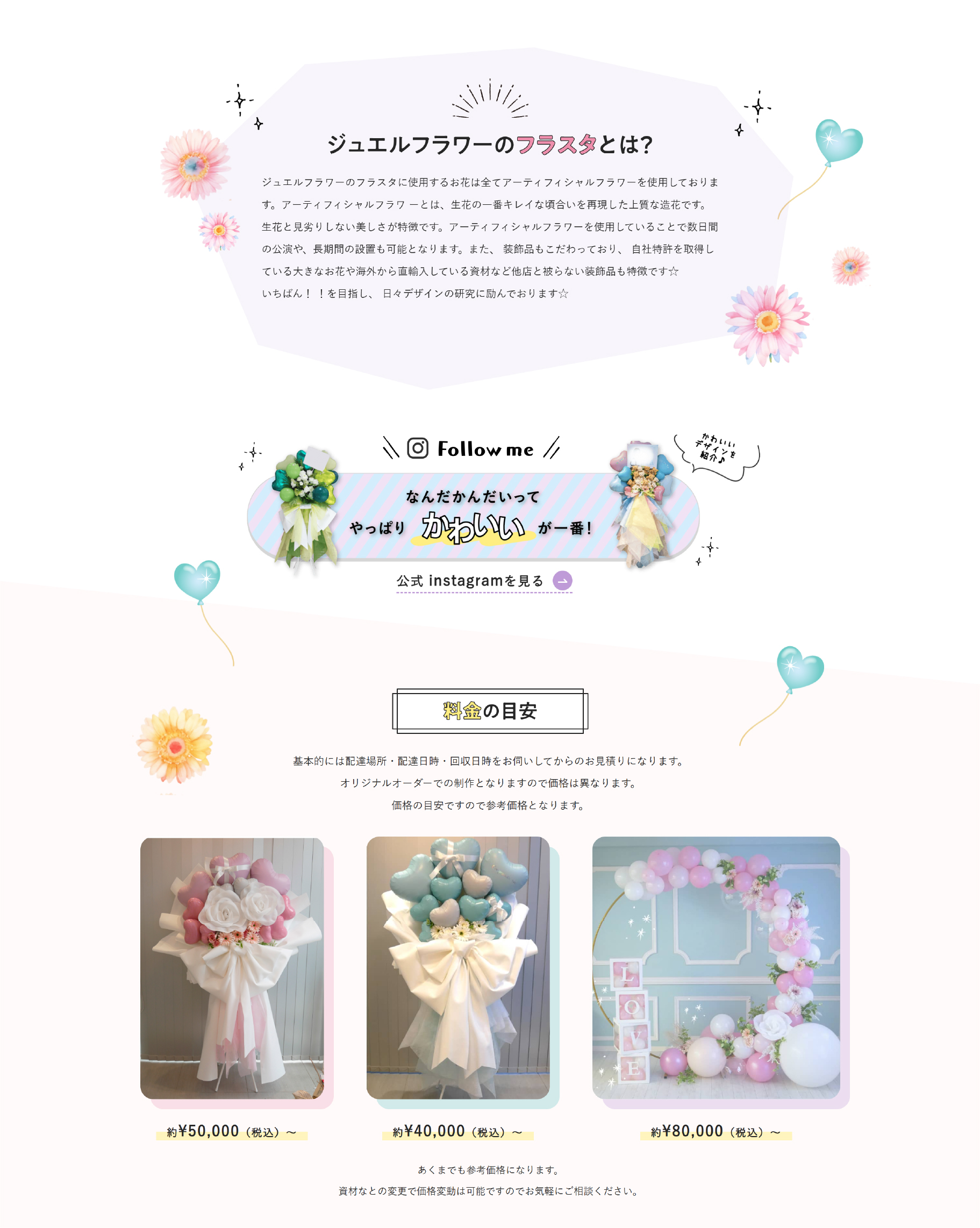 パステルカラーをベースに、サイト全体にお花をあしらい、一目で華やかさと可愛らしさが伝わるデザインに。