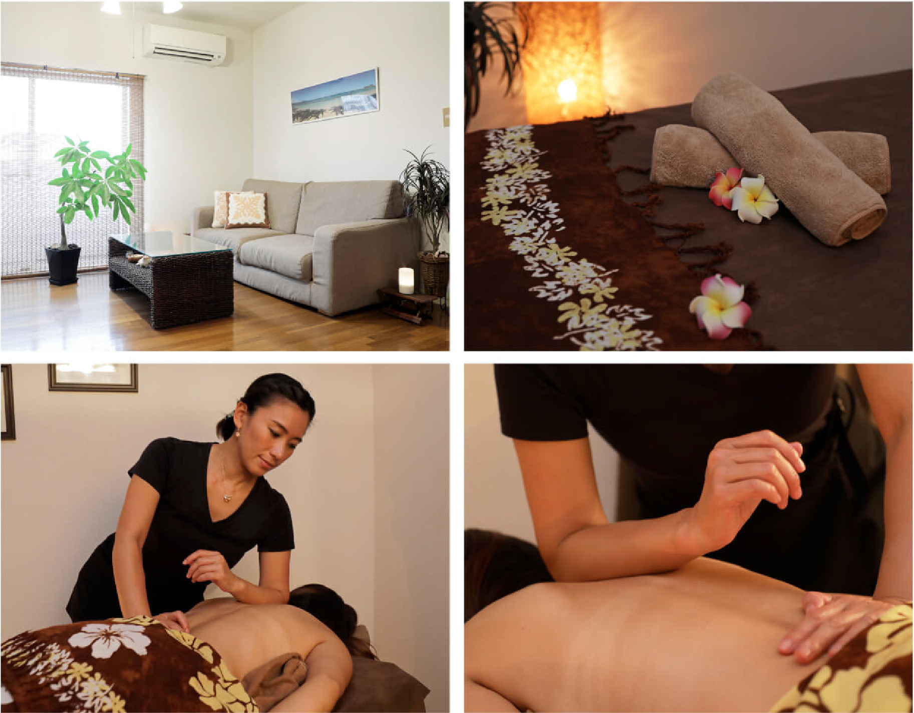 ハワイのビーチにいるようなゆったりとした空間の中で、強圧オールハンド施術により首・肩こりや腰痛など、日常に蓄積した疲労を根本から整えていきます。